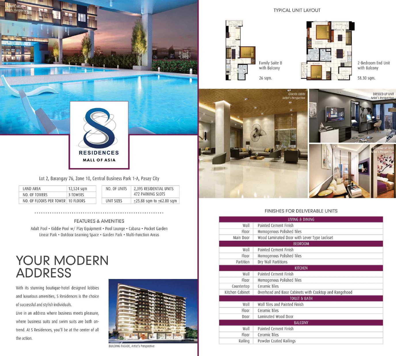 With its stunning boutique hotel-styled lobbies and luxurious amenities, S Residences is a condominium in Pasay within the MoA complex that perfectly fits successful and stylish individuals. Here, business meets pleasure in the best way.
